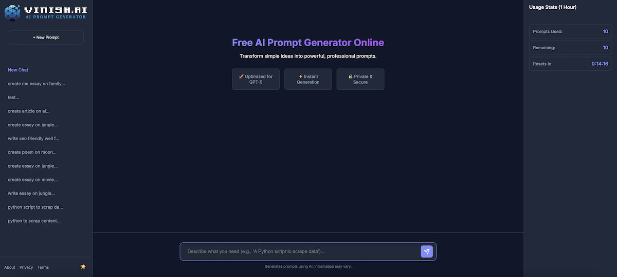 While AI models like ChatGPT, Claude, and Gemini are powerful, their output is often only as good as the instructions they receive. Vinish.ai solves this “blank page” problem by automatically generating structured, high-quality prompts tailored to specific user needs. Users simply input a basic idea, and the tool expands it into a sophisticated prompt that maximizes the AI’s reasoning and creative capabilities.