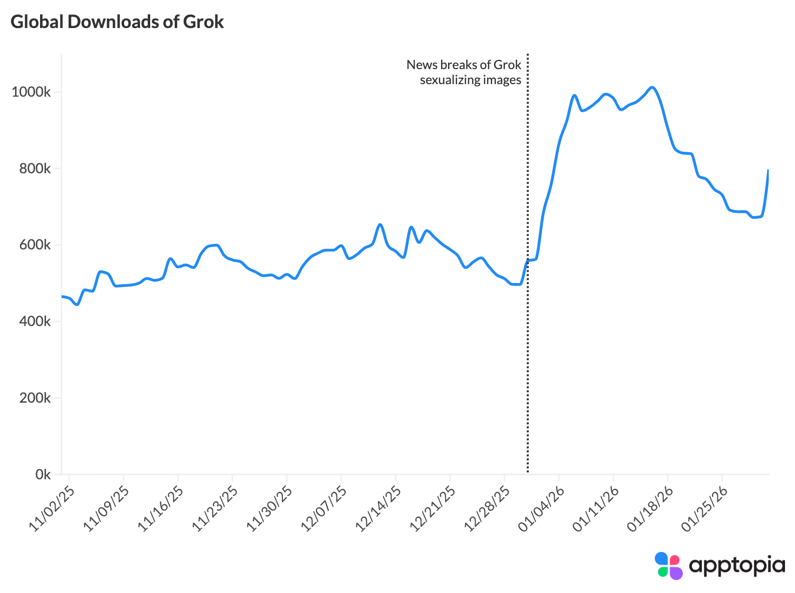 The download spike took the app from around 500,000 daily downloads in late December to close to 1 million in early January, and lined up with Grok’s jump from 12.0% to 15.2% market share between December 2025 and January 2026.