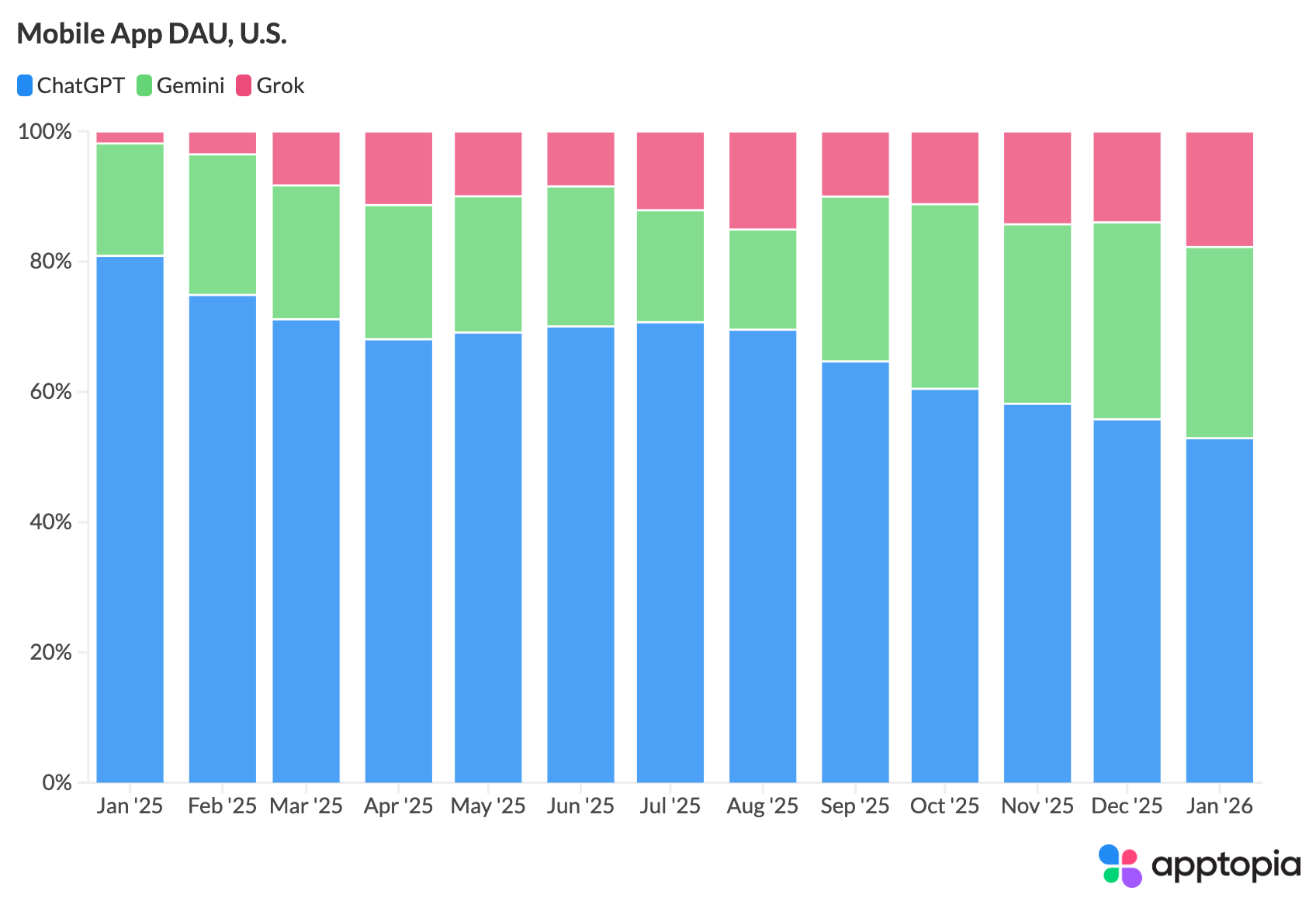 Elon Musk’s AI bot Grok is ascending, jumping from 1.6% to 15.2% in market share among daily U.S. users of chatbot apps from January 2025 to January 2026, according to mobile insights firm Apptopia.