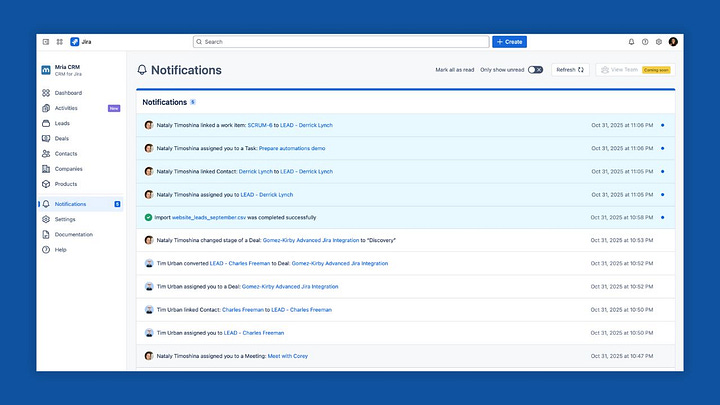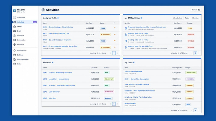 Mria CRM is offered as a Forge-based application for Jira Cloud and is listed on the Atlassian Marketplace. The newly released capabilities — including Leads Import, Contacts Import, the Activities module, and CRM Notifications — are available in the current version of the app. Teams can review configuration guidance, onboarding materials, and usage recommendations through the product’s documentation, while the public roadmap outlines planned enhancements and in-progress integrations.