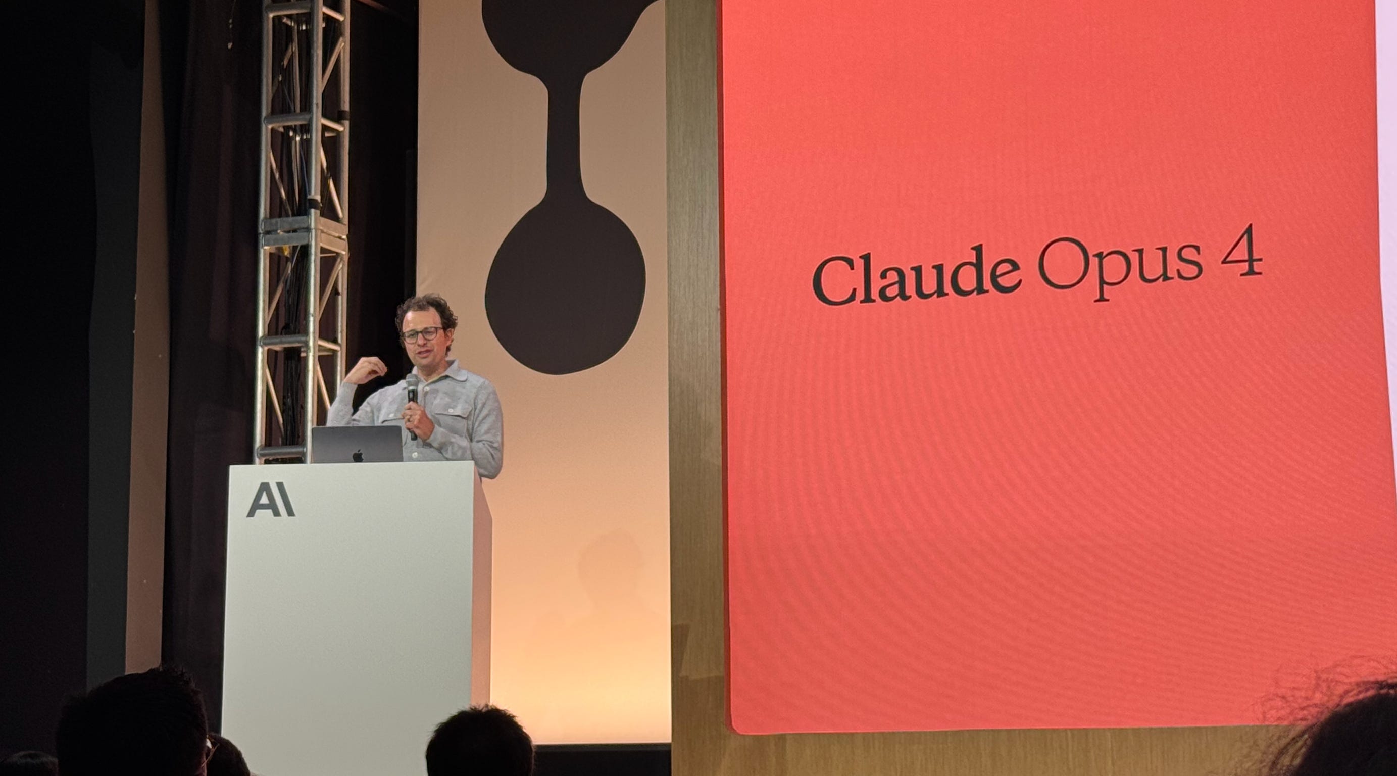 Amodei takes the stage and introduces Claude 4. Instead of a flashy presentation, he picks up a handheld mic, makes the announcement, reads his notes from a laptop, and then turns the spotlight over to Anthropic product head Mike Krieger. The crowd seems into it.