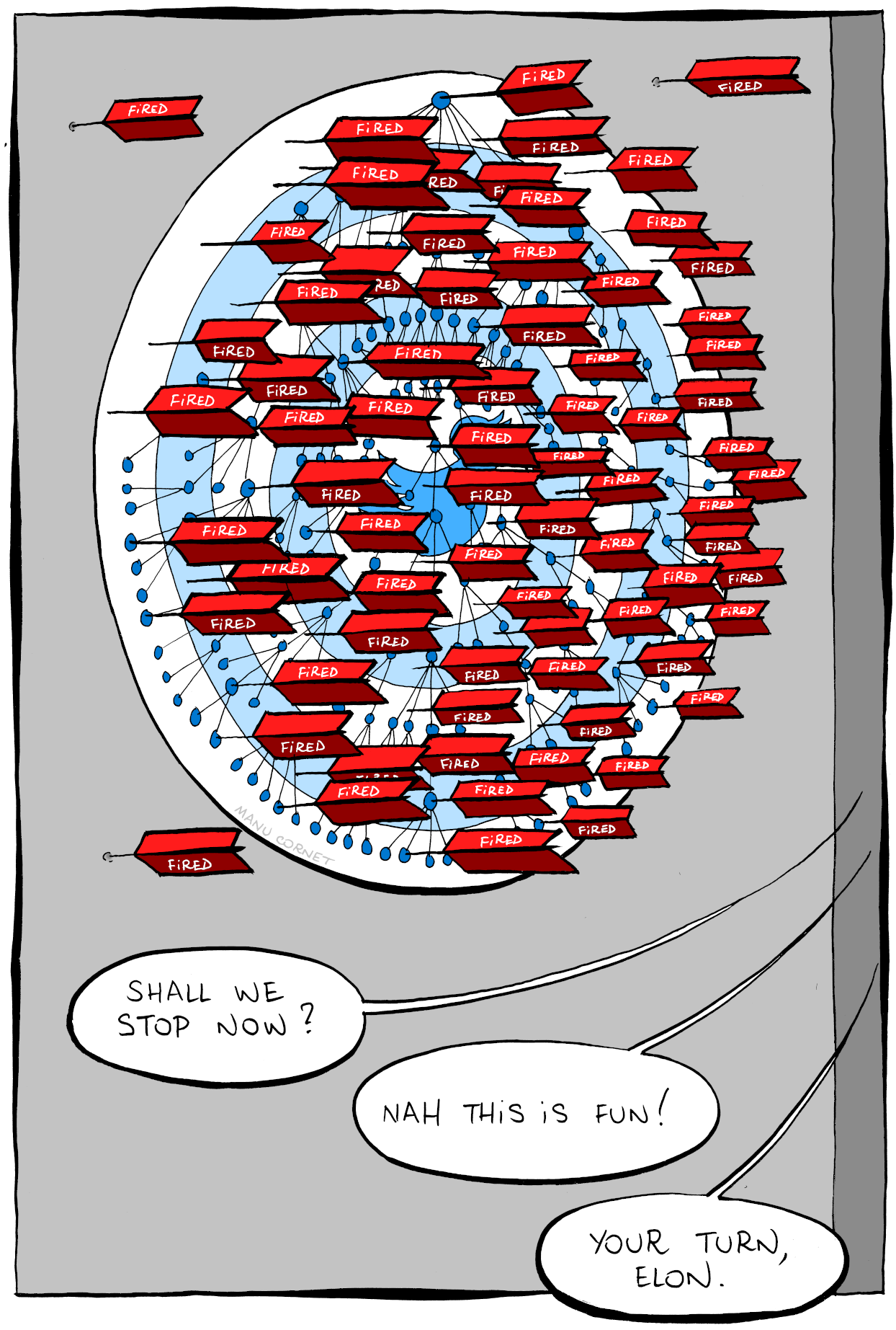 Just like that, Manu Cornet’s time at Twitter was over. The prolific cartoonist and software engineer watched his services disconnect and laptop go blank in a meeting on November 1. Less than a half hour later, he learned he was out, an early cut among the 3,700+ Twitter employees who lost their jobs this month.
